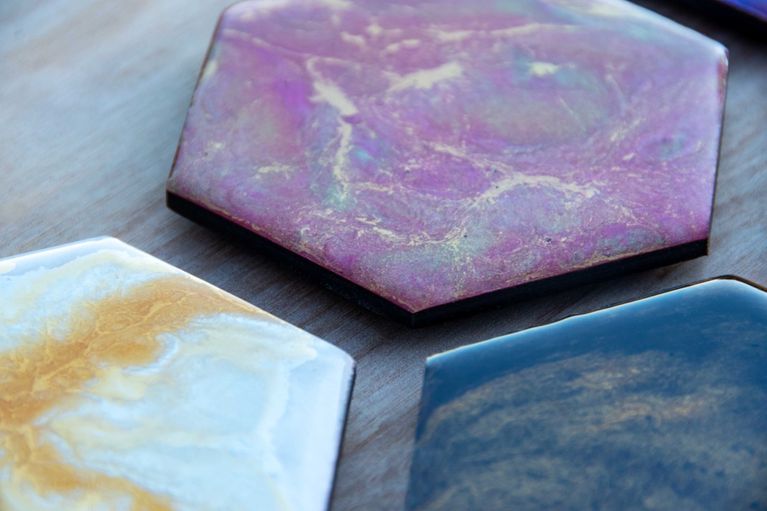 These resin coasters are designed to mimic the silhouette of a D20. All are hand designed so no two coasters are identical.
